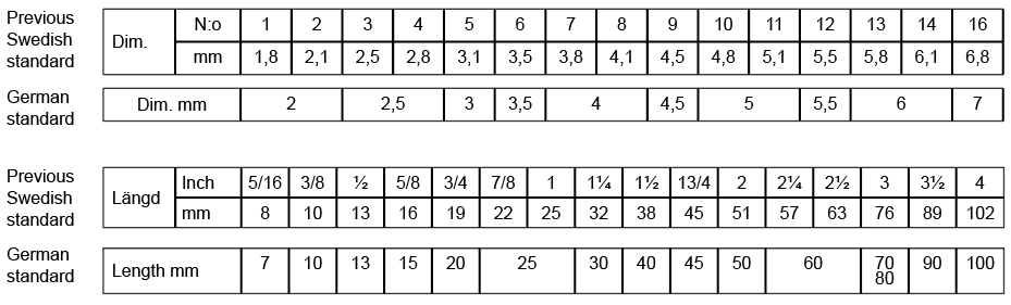 Our wood screws comply with the old Swedish standard. The thickness is specified in numerical dimensions based on an original English thread gauge, and the length is specified in English inches.