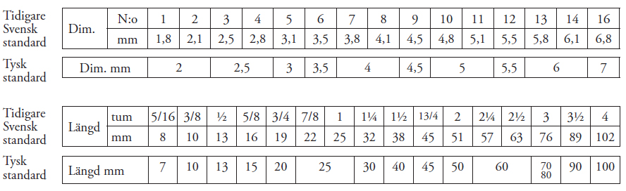 Vår träskruv följer den gamla svenska standarden. Tjockleken anges i nummerdimensioner efter en ursprungligen engelsk trådklinka och längden anges i engelska tum.