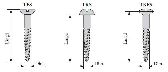 Tyvärr finns inte längre någon svensk tillverkning av träskruv. De vanligaste dimensionerna i sortimentet är nytillverkad skruv av tyskt fabrikat. Denna skruv är rullgängad och delgängad. Övriga dimensioner kommer från gamla lager av i första hand Aug. Stenmans/Assas tillverkning. Dessa skruvar är delgängade och svarvade. Dimensioner och längder överensstämmer inte alltid mellan svensk och tysk standard. Rådgör med återförsäljare eller Eskilstuna Kulturbeslag vid tveksamhet.